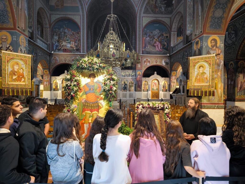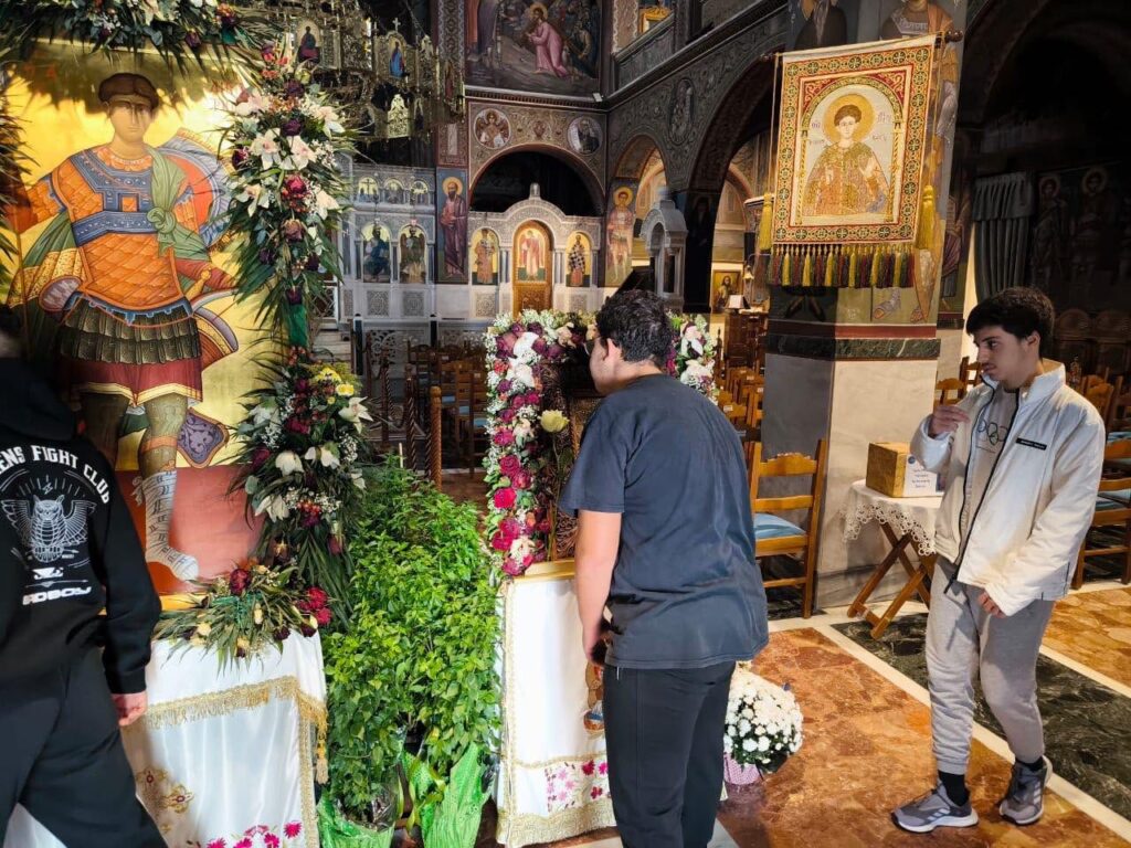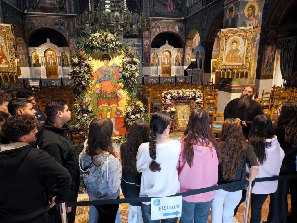 Μεγάλη χαρά για τον Πειραιά μα και για τους μαθητές της Β’ Λυκείου των Εκπαιδευτηρίων μας.. Οι μαθητές μας, πήγαν να προσκυνήσουν στον Άγιο Δημήτριο Πειραιώς,την Ιερά εικόνα της Παναγίας της Χρυσοπηγής εκ της Σίφνου,την εφέστιο εικόνα του Ναού μα και σήμερα είχαν τεθεί προς ευλογίαν και προσκύνηση ξύλινα χειροτεχνήματα του Αγίου Παϊσίου(σταυρουδάκια και ξύλινη εικόνα απεικονίζουσα την Υπεραγία Θεοτόκο). Εγκάρδια μάς υποδέχθηκε και μας μίλησε με πατρική αγάπη ο πατήρ Δημήτριος Αρώνης, προϊστάμενος του ιερού Ναού.